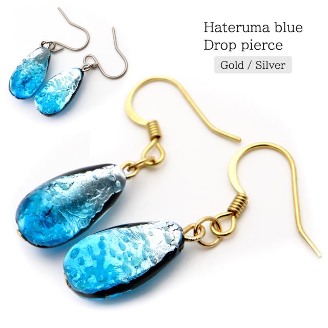 ハテルマブルー ホタルガラス ピアス しずく型 ドロップ チタン製 両耳用 とんぼ玉 沖縄 お土産