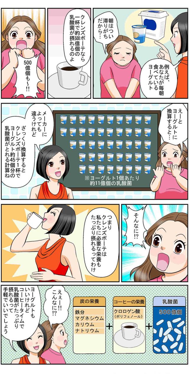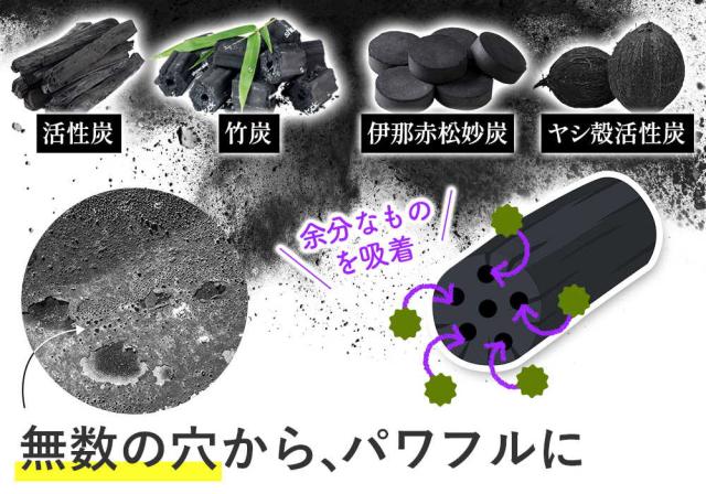 難消化性デキストリン(国内製造)、コーヒー、乳酸球菌EF-621K菌末、赤松炭、ヤシ殻活性炭、発酵紅茶エキス末(デキストリン、発酵紅茶エキス)、植物発酵末(デキストリン、黒糖、オレンジ、パイナップル、バナナ、リンゴ、パパイア、その他)、野草発酵エキス(オリゴ糖、糖蜜、てんさい糖、ヨモギ、その他)、植物発酵エキス末(デキストリン、糖蜜、黒砂糖、ヨモギ、ウコン、その他)、MCTオイルパウダー(中鎖脂肪酸油、デキストリン、加工でん粉)、L-カルニチンフマル酸塩、グリーンコーヒー豆エキス、酵母エキス(酵母エキス、デキストリン)、玄米麹、フラクトオリゴ糖、フィッシュコラーゲン、豚プラセンタエキス末、サラシア末、マンガン含有酵母、亜鉛含有酵母、銅含有酵母、クロム含有酵母、モリブデン含有酵母、セレン含有酵母 / 活性炭、微粒酸化ケイ素、香料、植物炭末色素、キトサン、ビタミンC、ナイアシン、ビタミンE、パントテン酸Ca、ビタミンB2、ビタミンB1、ビタミンB6、ビタミンA、葉酸、ビタミンD、ビタミンB12、(一部にオレンジ・カシューナッツ・キウイフルーツ・ごま・大豆・バナナ・りんご・やまいも・ゼラチン・豚肉・かにを含む)