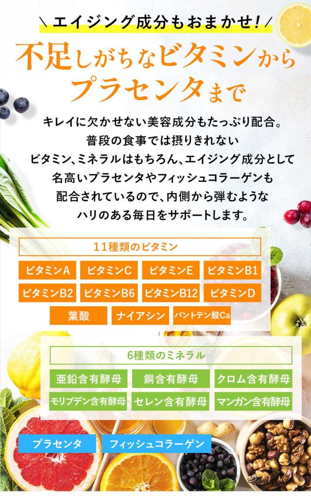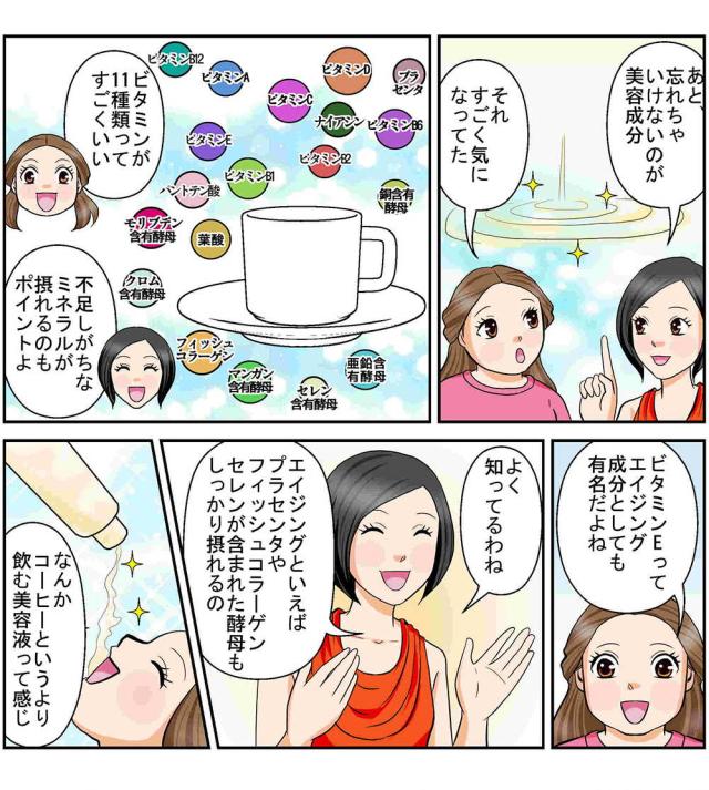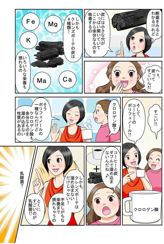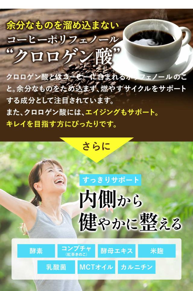 難消化性デキストリン(国内製造)、コーヒー、乳酸球菌EF-621K菌末、赤松炭、ヤシ殻活性炭、発酵紅茶エキス末(デキストリン、発酵紅茶エキス)、植物発酵末(デキストリン、黒糖、オレンジ、パイナップル、バナナ、リンゴ、パパイア、その他)、野草発酵エキス(オリゴ糖、糖蜜、てんさい糖、ヨモギ、その他)、植物発酵エキス末(デキストリン、糖蜜、黒砂糖、ヨモギ、ウコン、その他)、MCTオイルパウダー(中鎖脂肪酸油、デキストリン、加工でん粉)、L-カルニチンフマル酸塩、グリーンコーヒー豆エキス、酵母エキス(酵母エキス、デキストリン)、玄米麹、フラクトオリゴ糖、フィッシュコラーゲン、豚プラセンタエキス末、サラシア末、マンガン含有酵母、亜鉛含有酵母、銅含有酵母、クロム含有酵母、モリブデン含有酵母、セレン含有酵母 / 活性炭、微粒酸化ケイ素、甘味料(ステビア)、香料、植物炭末色素、キトサン、ビタミンC、ナイアシン、ビタミンE、パントテン酸Ca、ビタミンB2、ビタミンB1、ビタミンB6、ビタミンA、葉酸、ビタミンD、ビタミンB12、(一部にオレンジ・カシューナッツ・キウイフルーツ・ごま・大豆・バナナ・りんご・やまいも・ゼラチン・豚肉・かにを含む)