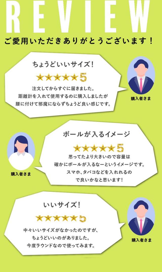 - 本日初めて使用しましたが、とても便利で助かりました。スマホやスコアカードが丁度ぴったり入る大きさです。なのでちょっと大きめですが、プレーにはぜんぜん支障ありませんでした。