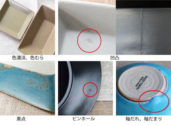 原料や製造方法により、上記のような特性がみられる場合があります。ひとつひとつのうつわの持つ個性、温かみある風合いとしてお楽しみいただければ幸いです。