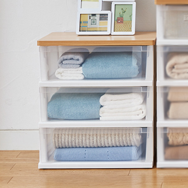 奥行40cmなので、 スペースを有効に使うことができます。もちろんクローゼットにも収まるサイズ感で、中身が見える便利なクリアタイプの引き出しです。