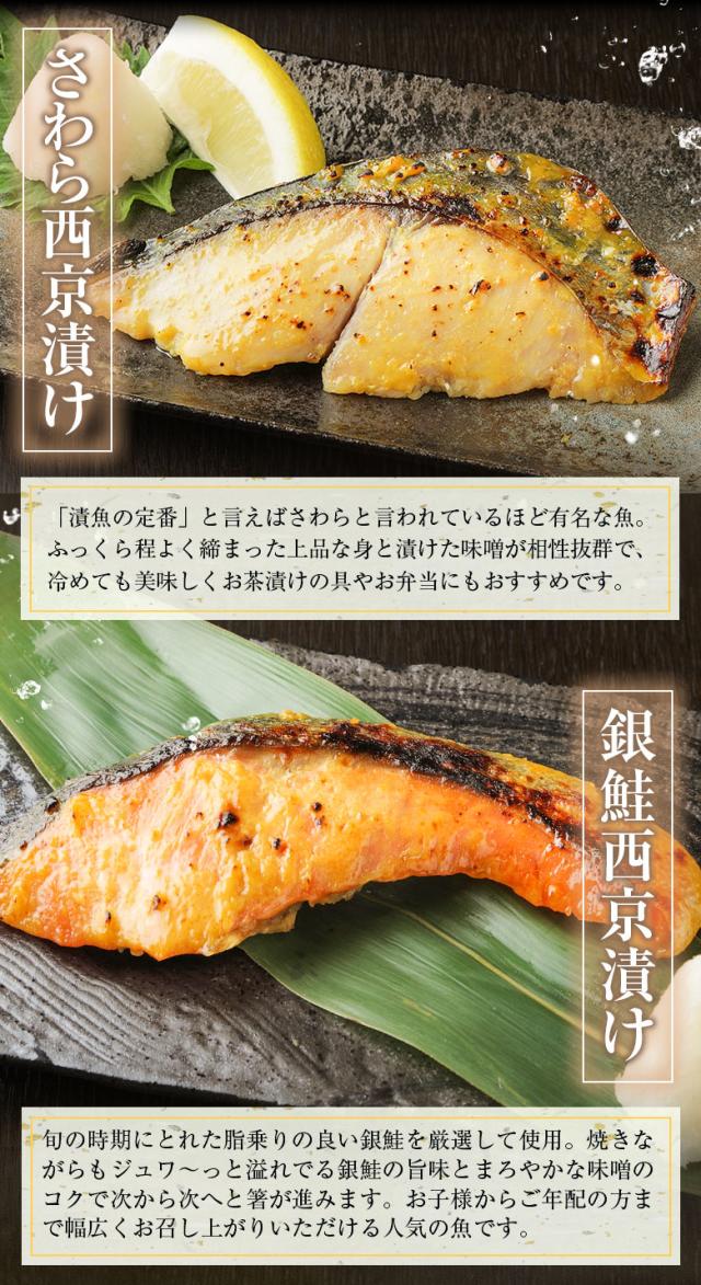 さば(ノルウェー産)、さわら(韓国又は中国産)、銀さけ(チリ産)、アラスカメヌケ(アメリカ又はアイスランド産)、縞ほっけ(ロシア又はアメリカ産)、西京漬調味[味噌(国内製造)、砂糖、甘酒、米発酵調味料、醸造酢、食塩、醤油、魚醤、清酒、ウコン末、食物繊維、酵母エキス、白キクラゲ抽出物/増粘剤(加工デンプン、キサンタン)]、(一部に小麦・オレンジ・大豆・さば・さけを含む)