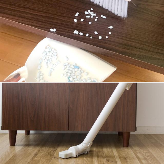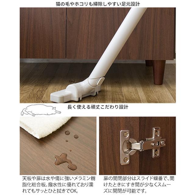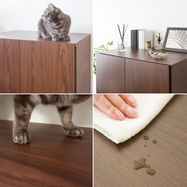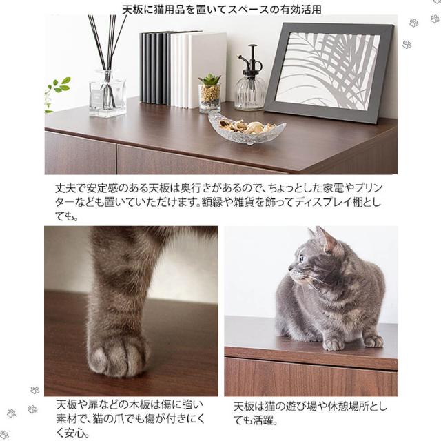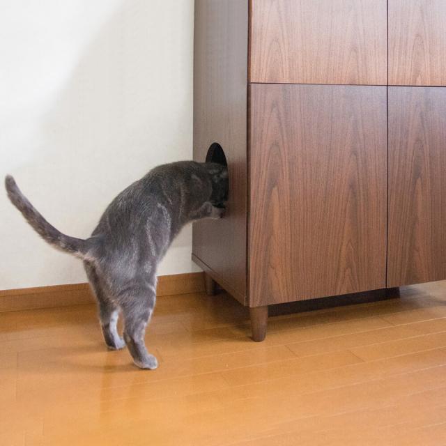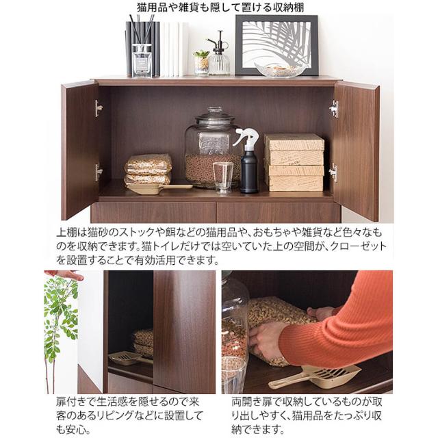 扉付きの上棚に猫砂のストックなどの猫用品をたっぷり収納可能。