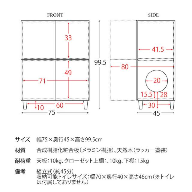 本体サイズ:幅 75cm × 奥行き 45cm × 高さ 99.5cm耐荷重: 天板 10kg、クローゼット上棚 10kg、下棚 15kg