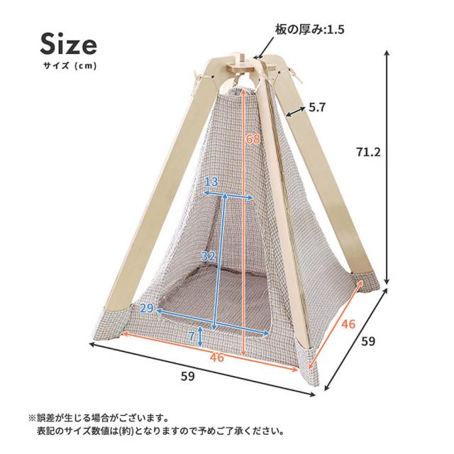 本体:幅 84.5cm × 奥行 84.5cm × 高さ 71.2cmテント内寸 : 幅 46cm × 奥行 46cm × 高さ 68cm