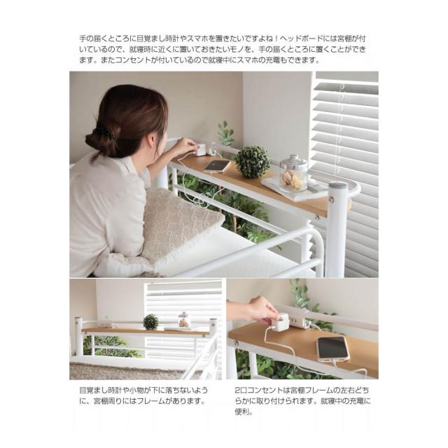 ヘッドボードには宮棚がついており、読みかけの本やスマホなど、身近に置いておきたいモノを手の届くところに置くことがきます。
