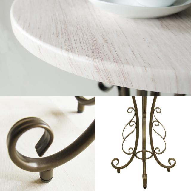 控えめな木目のキレイなまぁるいラウンドテーブルと装飾にこだわった脚部のデザインが存在感バツグン。