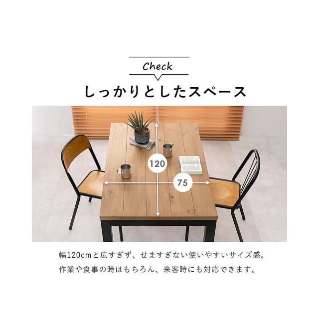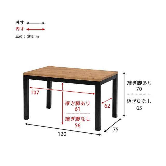 幅 120cm x 奥行 75cm x 高さ65cm (継ぎ脚使用時の高さ : 70cm)素材