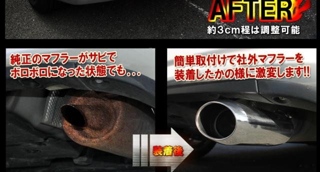 【商品名】マフラーカッター【適合車種】プリウスα 前期/後期【適合型式】ZVW40/ZVW41【適合年式】H23.5〜【商品説明】ステンレス製で錆に強く、キラキラのマフラーはドレスアップ効果大!!付属のボルトを6角レンチで締め込んで固定するだけの簡単お取り付け。たった5分でマフラーの印象が変わります!!※お取り付けの際は、マフラーの熱が冷めてから行って下さい。※緩み・外れの原因となる為、ボルトの締め付けは必ずしっかりと行って下さい。【送料】全国一律880円、北海道1,430円、沖縄・離島は別途必要となります。