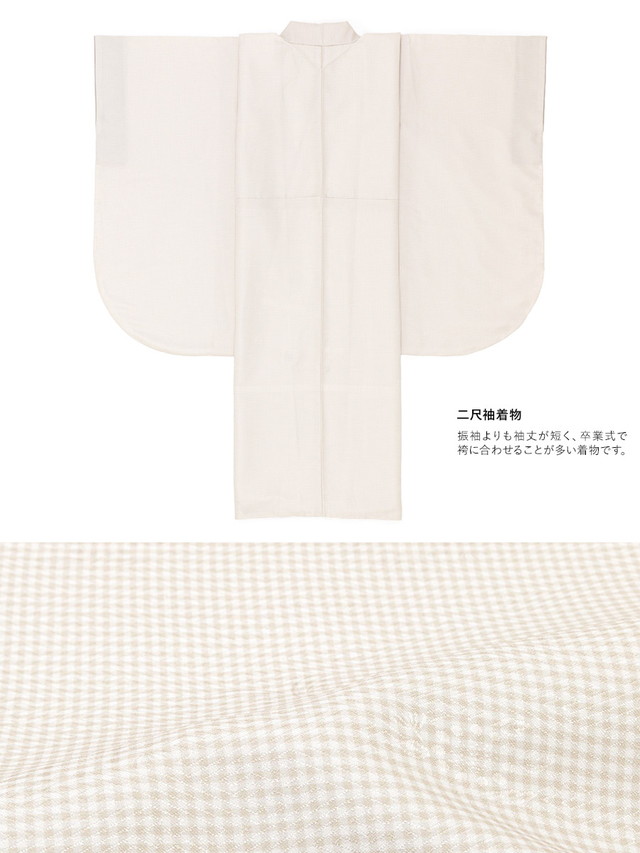 『bonheur saisons』の二尺袖着物は、菊紗綾形の織柄の生地に、細かいチェックの大人可愛いデザインです。