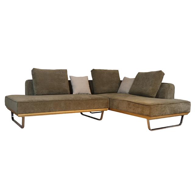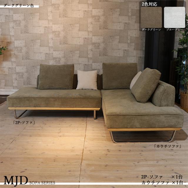 MJD-2PCC 二人掛けソファーとカウチソファのセット 大小クッション5個付 ダークグリーン色/カーキー色 スエード調布張り スチール脚 北欧 完成品 ベンチタイプ