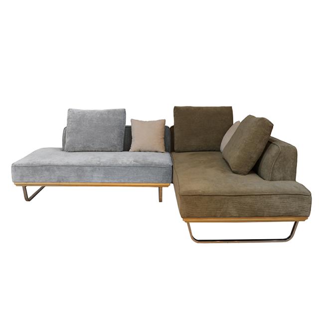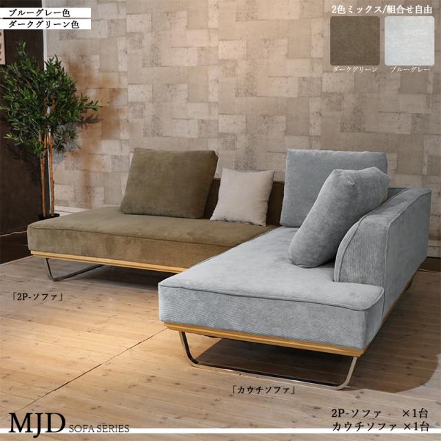【ミックス張地タイプ】MJD-2PCC 二人掛けソファーとカウチソファのセット 大小クッション5個付 ダークグリーン色/ブルーグレー色 スエード調布張り スチール脚 北欧 完成品 ベンチタイプ