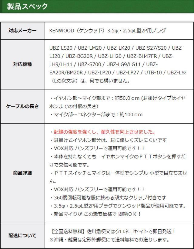 ケンウッド イヤホンマイク 2ピン KENWOOD デミトス DEMITOSS用 耳掛け式 10個セット UBZ-LS20 UBZ-LP20 UBZ-LM20 UBZ-EA20R UBZ-LK20 UBZ-LP27R UTB-10用 イヤフォンマイク インカムマイク EMC-3 EMC-3A EMC-12互換 ハンズフリー VOX対応