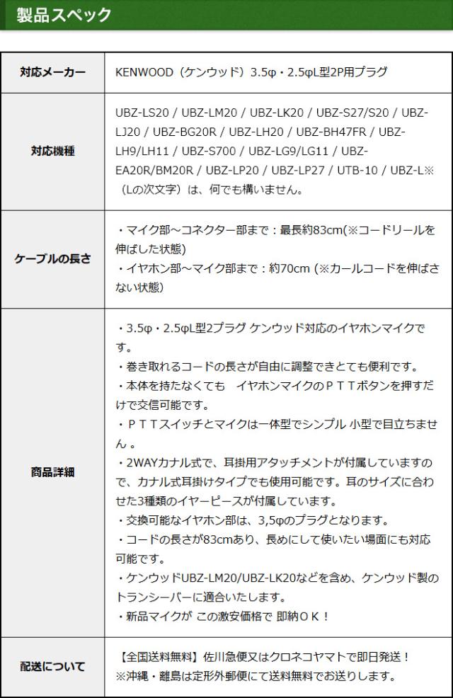 ケンウッド イヤホンマイク 2ピン KENWOOD デミトス DEMITOSS用 コードリール仕様 カナル式 UBZ-LS20 UBZ-LP20 UBZ-LM20 UBZ-EA20R UBZ-LK20 UBZ-LP27R UBZ-BM20R UBZ-S20 UTB-10用 トランシーバー用 イヤフォンマイク インカム EMC-3/EMC-11互換 イヤーピーススペア付