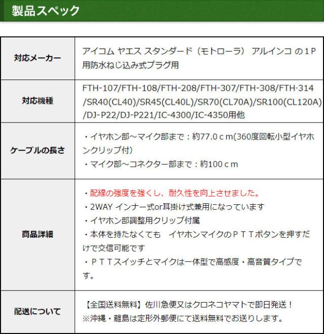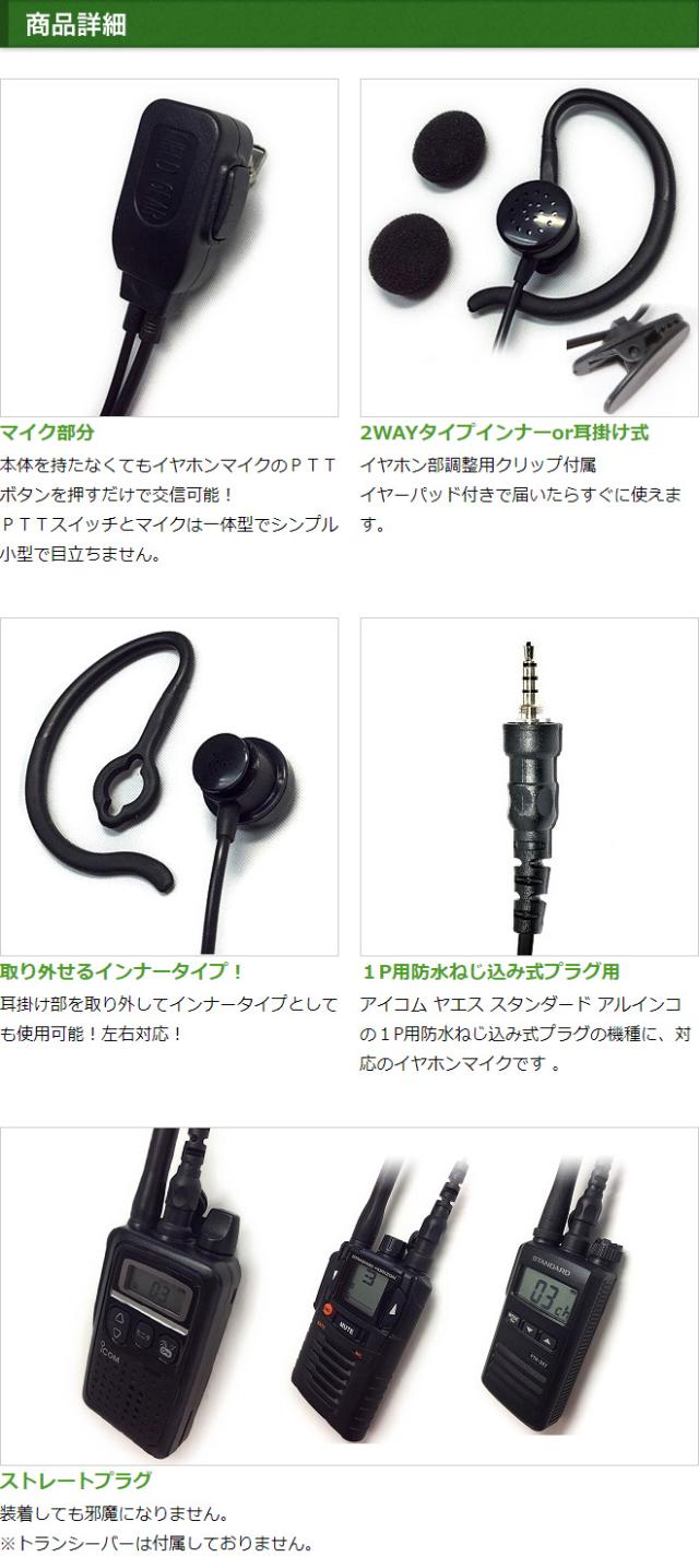 アイコム イヤホンマイク ヤエス スタンダード アルインコにも対応 2WAY インナー式or耳掛け式 高感度 高音質 1ピン防水ねじ込み式プラグ インカムマイク IC-4300 IC-4350 FTH-208 FTH-307 FTH-308 SR-40 SR-45 SR-70 SR-100 DJ-P221用 EME-36A HM-177PI SSM-59互換品