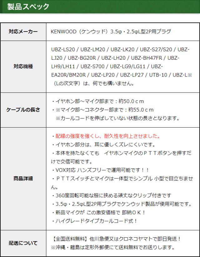 ケンウッド イヤホンマイク 2ピン KENWOOD デミトス DEMITOSS用 ハイグレードタイプカールコード式 10個セット UBZ-LS20 UBZ-LP20 UBZ-LM20 UBZ-EA20R UBZ-LK20 UBZ-LP27R UBZ-BM20R UBZ-S20 UTB-10用 インカムマイク イヤフォンマイク EMC-3 EMC-3A EMC-11互換 VOX対応