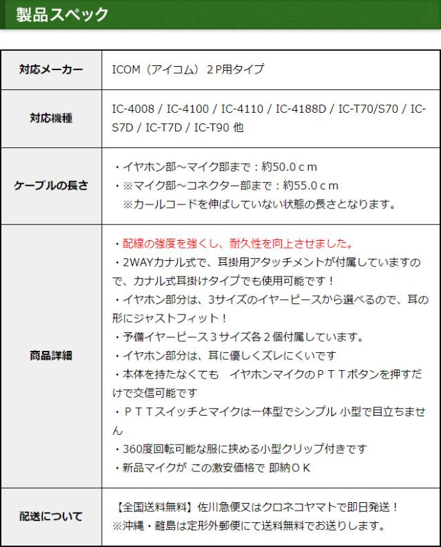 アイコム イヤホンマイク ICOM 2ピン用 2WAY カナル式 特定トランシーバー用 ハイグレードタイプカールコード式 イヤフォンマイク インカムマイク IC-4008 IC-4100 IC-4088D IC-T70 S70 IC-S7D IC-T7D IC-T90用【HM-177L HM-166互換】