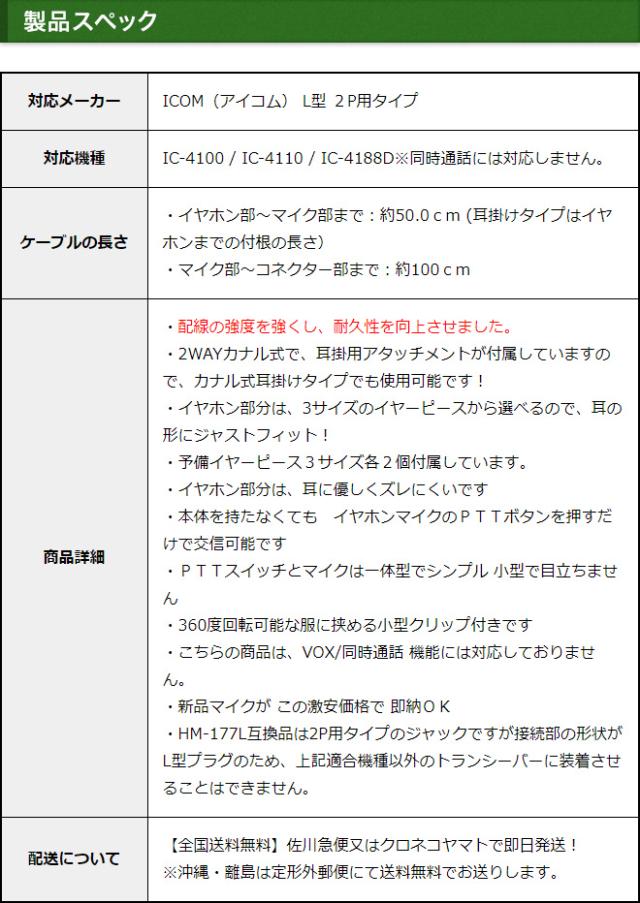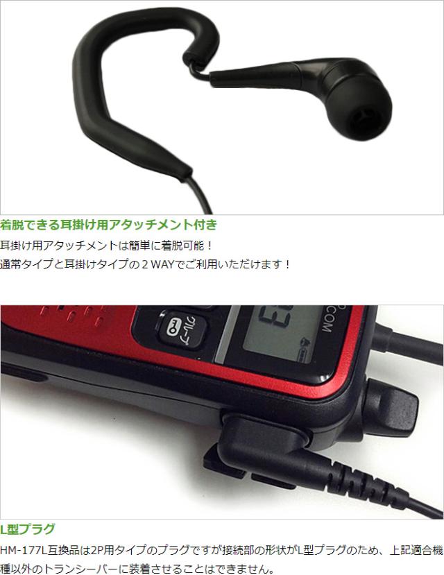 アイコム イヤホンマイク ICOM L型 2ピン用 2WAY カナル式 小電力トランシーバー用 イヤフォンマイク インカムマイク IC-4100 IC-4110 IC-4188D用【HM-177L互換品番】
