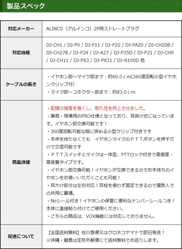 アルインコ イヤホンマイク ALINCO 2ピン用 業務 現場用 PRO仕様 耳掛け式 インカムマイク 高感度 高音質 DJ-P9 DJ-P11 DJ-P20 DJ-PA20 DJ-CH20B DJ-CH27B DJ-P24 DJ-A27 DJ-P35D DJ-P21 DJ-CH1 DJ-CH9 DJ-CH11 DJ-PX31 DJ-R100D用【EME-34A EME-52A互換品番】