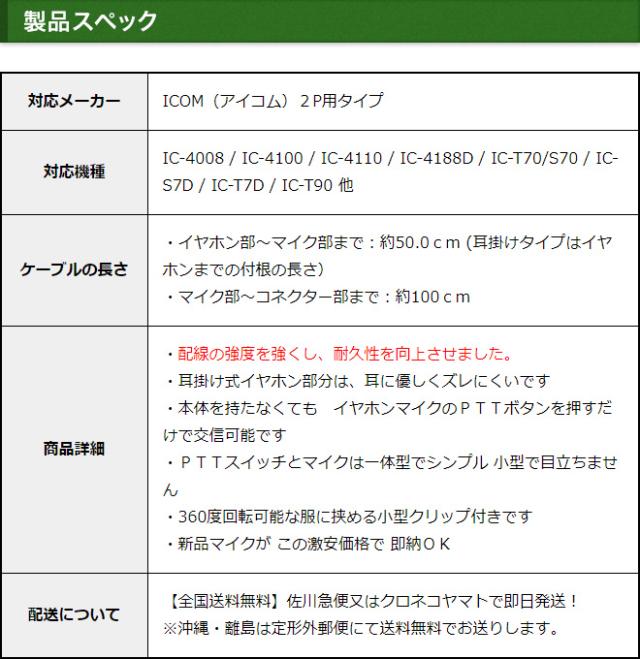 アイコム イヤホンマイク ICOM 2ピン用 耳掛け式 イヤホンマイク イヤフォンマイク インカムマイク IC-4008 IC-4100 IC-4088D IC-T70 S70 IC-S7D IC-T7D IC-T90用 【HM-177L HM-166互換品番】