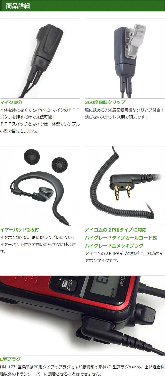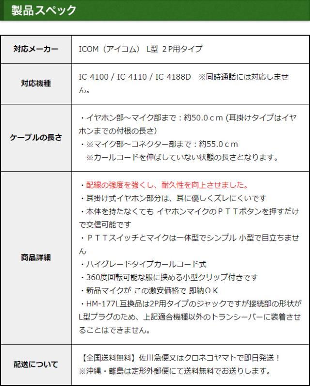 アイコム イヤホンマイク ICOM L型 2ピン用 トランシーバー用 耳掛け式HGカールコード式 イヤフォンマイク インカムマイク IC-4100 IC-4110 IC-4188D用【HM-177L互換品番】