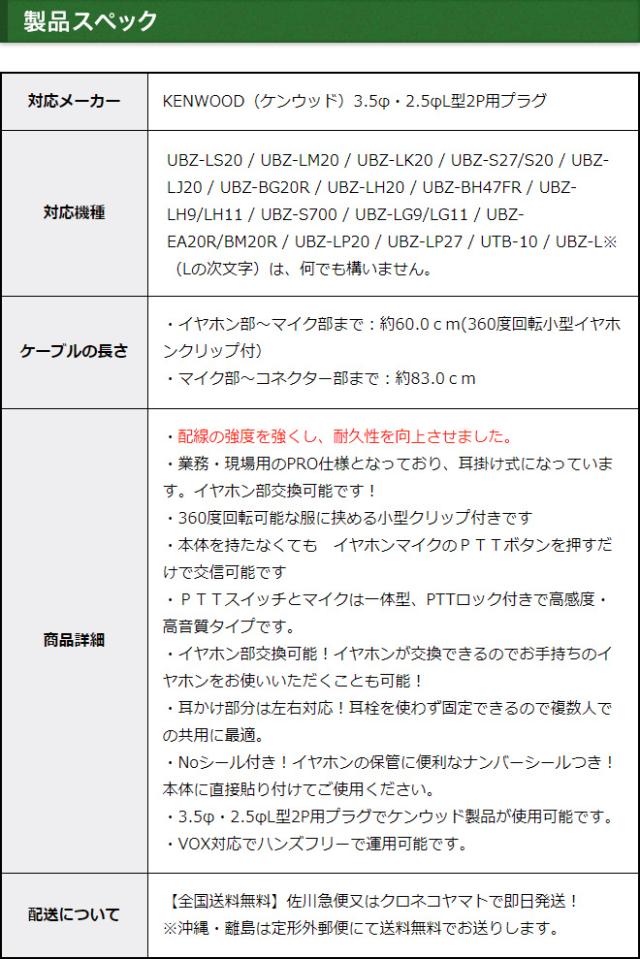 ケンウッド イヤホンマイク 2ピン デミトス用 業務 現場用 PRO仕様 耳掛け式 インカムマイク 高感度 高音質 UBZ-LS20 UBZ-LP20 UBZ-LM20 UBZ-EA20R UBZ-LK20 UBZ-LP27R UBZ-BM20R UBZ-S20 UTB-10用 EMC-3 EMC-3A EMC-12互換品 VOX対応ハンズフリー