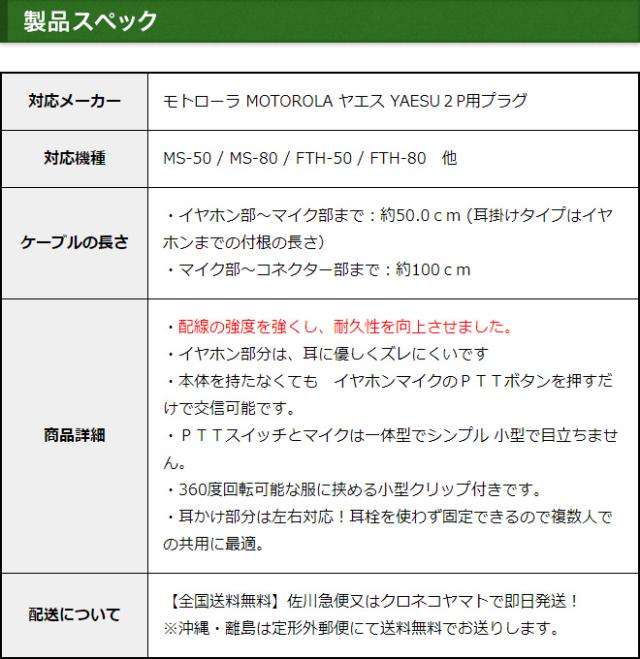 モトローラ ヤエス イヤホンマイク 2ピン用 オープン型 オンイヤー 耳掛け式 MOTOROLA YAESU MS-50 MS-80 FTH-50 FTH-80用 イヤフォンマイク インカムマイク【JSPRN0001 JSPRN0002 JSPRN0003 JSPMN0001互換品】