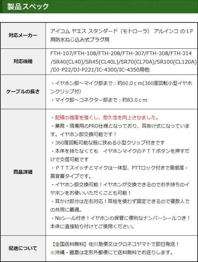 アイコム ヤエス スタンダード アルインコ イヤホンマイク 1ピン防水ねじ込み式プラグ用 インカムマイク 業務 現場用 PRO仕様 耳掛け式 IC-4300 IC-4350 FTH-208 FTH-307 FTH-308 FTH-314 SR-40 SR-45 SR-70 SR-100 DJ-P221用 EME-36A HM-177PI SSM-59互換品