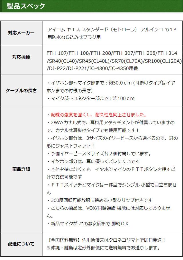 アイコム ヤエス スタンダード アルインコ イヤホンマイク 2WAY カナル式1ピン防水ねじ込式 インカムマイク IC-4300 IC-4350 FTH-107 FTH-108 FTH-208 FTH-307 FTH-308 FTH-314SR-40 SR-45 SR-70 SR-100 DJ-P221用 EME-36A HM-177PI SSM-59互換品