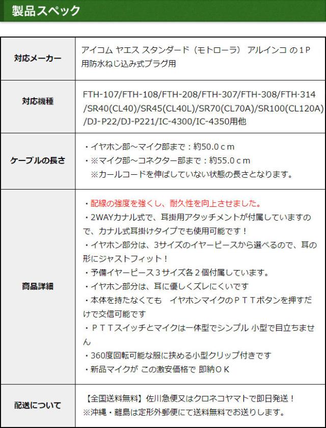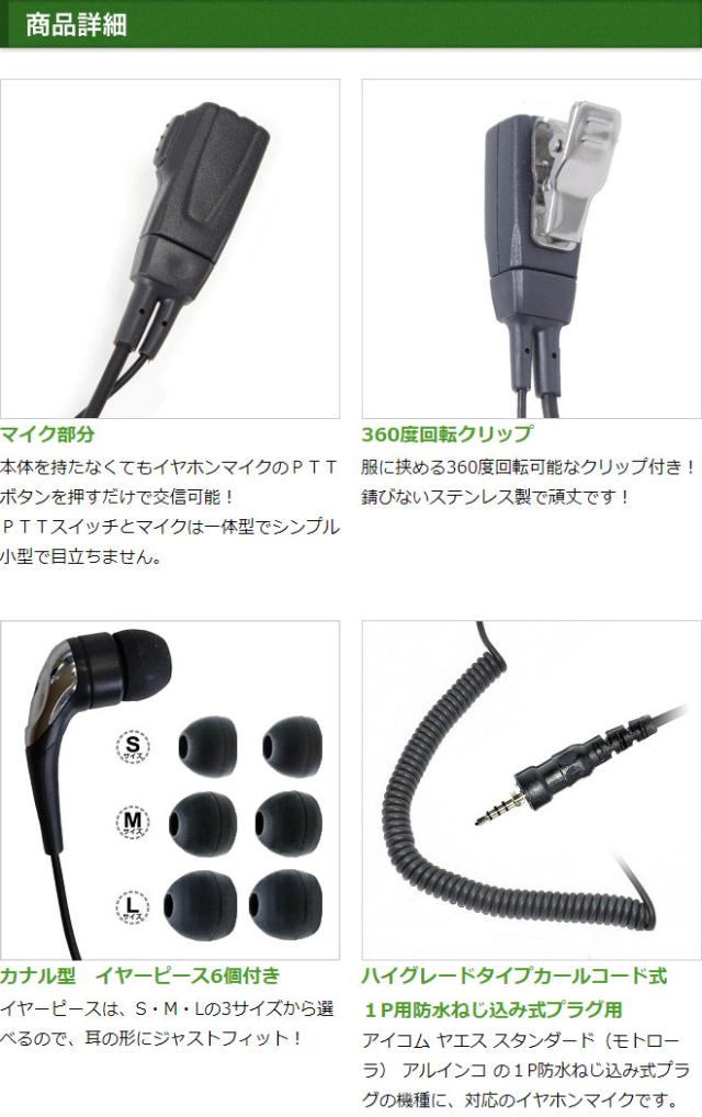 アイコム ヤエス スタンダード アルインコ 2WAY カナル式 イヤホンマイク ハイグレードカールコード インカムマイク 1ピン防水ねじ込み式プラグ IC-4300 IC-4350 FTH-208 FTH-307 FTH-308 FTH-314 SR-40 SR-45 SR-70 SR-100 DJ-P221用 EME-36A HM-177PI SSM-59互換品