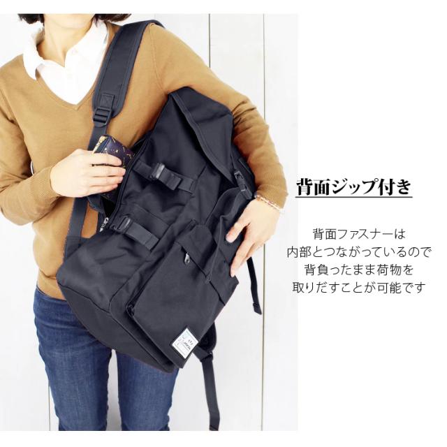 背面ジッパーが付いているので背負ったままでも荷物を取り出せることができ便利。