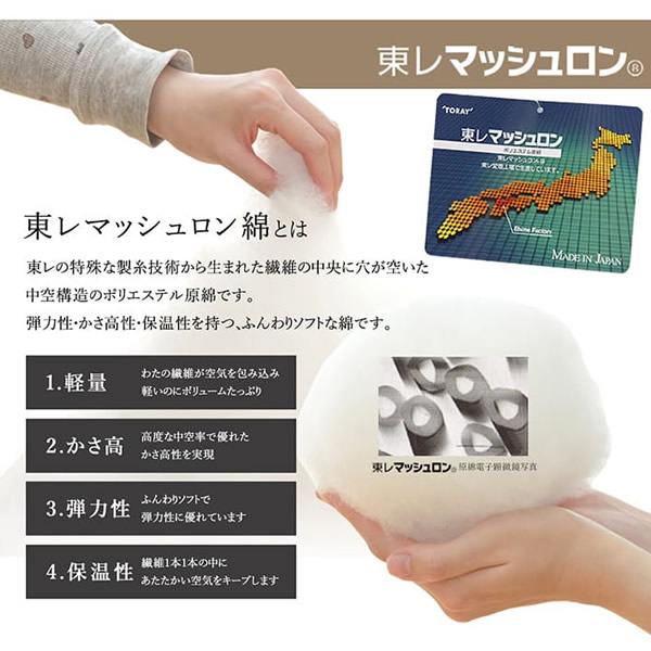 ※写真はメーカー様のカタログ等から掲載させて頂いております。 実物の商品と写真の色が若干写真写り等により異なる場合がありますのでご注意くださいませ。 万が一の際でございましても返品はお受け致しかねます。 ■組成 表地=ポリエステル100% 裏地=ポリエステル100% 中材=ポリエステル100%(綿量1.5kg) ■原産国:日本製(側=中国製 最終加工=日本) ■洗濯表示 40℃以下の水温で弱い手洗いで洗濯してください。(洗濯機不可) 干し方=日陰のつり干しがよい。 ※記載は商品仕様の一部です。仕様説明不足等の理由での返品はできません。特に適合等は必ずご確認ください。