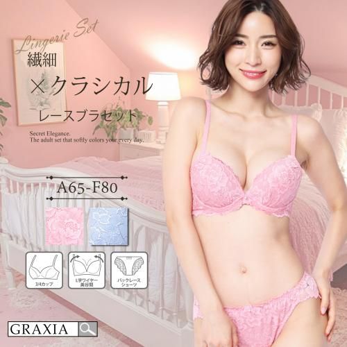 【グラシア】 ブラジャー ショーツ セット ブラセット ランジェリー 下着 チャーム クラシカル フラワーレース 可愛い 健康的 繊細 大人 レース バックレース ブルー ピンク