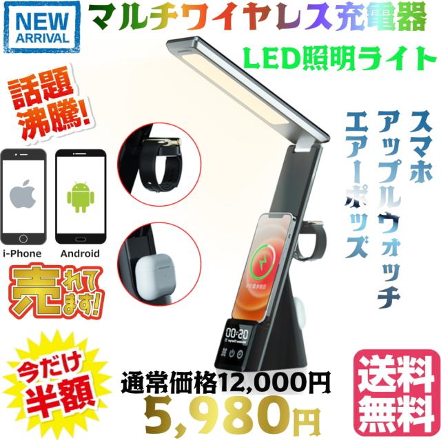 最新ワイヤレス(非接触)マルチ充電器、6in1多機能、LED照明(3パターン)、i-Phone,Androidスマホ、アップルwatch、AirPodsイヤホンなど