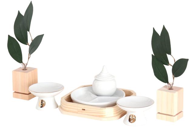 和室にも洋室にも、自然とマッチする優しい風合いのモダン神具セット。色々なタイプの神棚に合うよう、ナチュラルで柔らかい木目の桧、なめらかな瀬戸焼の陶器を織り交ぜたセットです。日ごろの感謝と願いを込めてお供えを、高らかに柏手を。