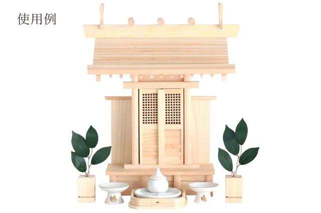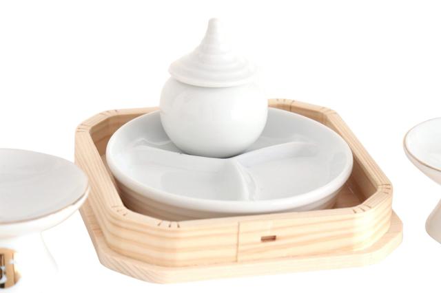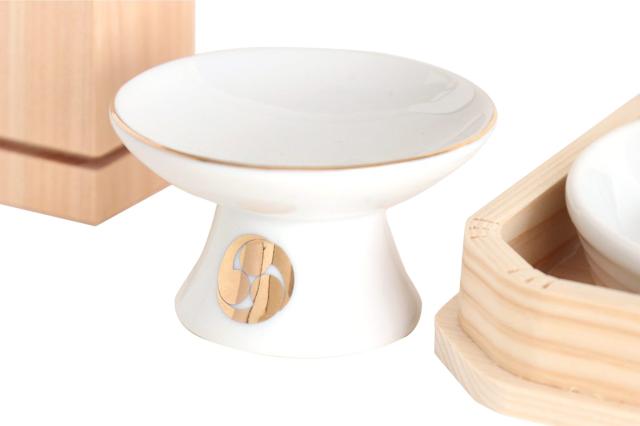 神社のアイコン「巴紋」 魔除けと厄除けを願い、お神酒の盃には「三つ巴」の紋をあしらっています。大切なお水・お米・お塩は、丸い陶器に一緒に盛って、折敷でお供えします。モダン神棚のほか、「一社」や横幅50センチまでの小型の「三社」「箱宮」などに適したサイズ感。コンパクトなのでお取替えやお掃除が簡単なのもポイント。 |