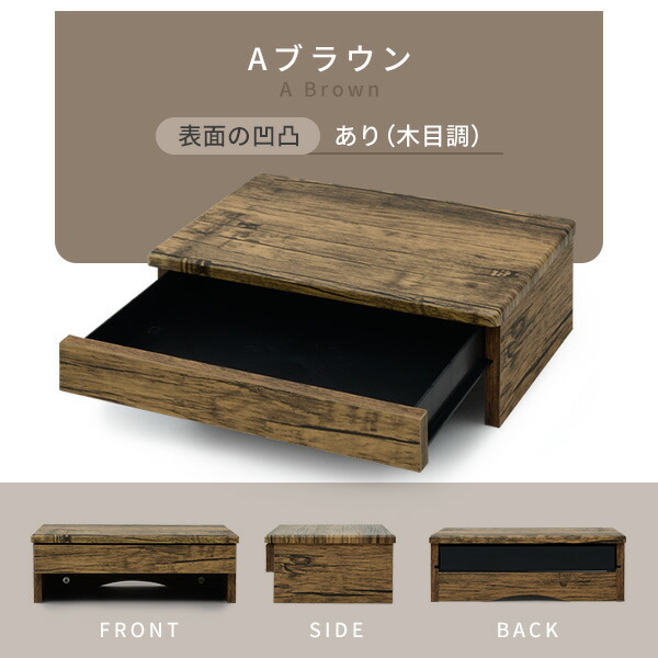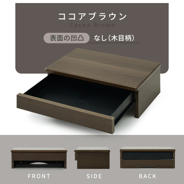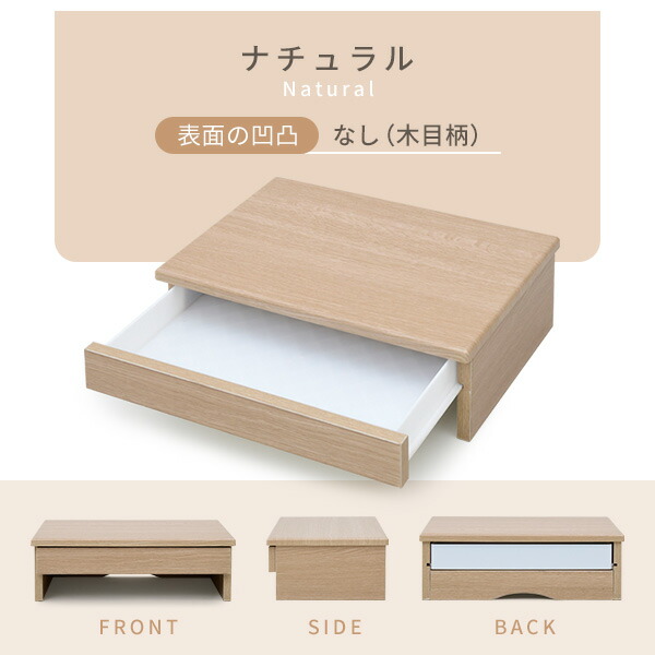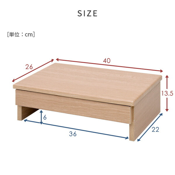 | 商品説明 | ●キーボードやマウスを収納してデスク上を有効活用できるモニタースタンド ●FAXやプリンター台としても便利 ●A4サイズの入る引き出し付き ●背面底にはケーブル類を通せるスリット入りで配線がスッキリ ●引き出し下は高さ6cmでキーボードやマウスもしっかり収納 ●コード穴:高さ1.5cm(1箇所) ●天板有効サイズ:幅40 奥行26cm ●引き出し内寸:幅34.5 奥行23 高さ4.5cm ●引き出し下内寸:幅36 奥行22 高さ6cm ●耐荷重:天板10kg 引き出し1.5kg ※2022年11月よりアンティークアイボリー、ウッドナチュラル、アンティークブラウン、ココアブラウンを追加しました。 |