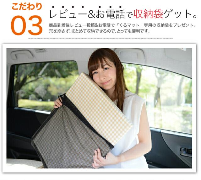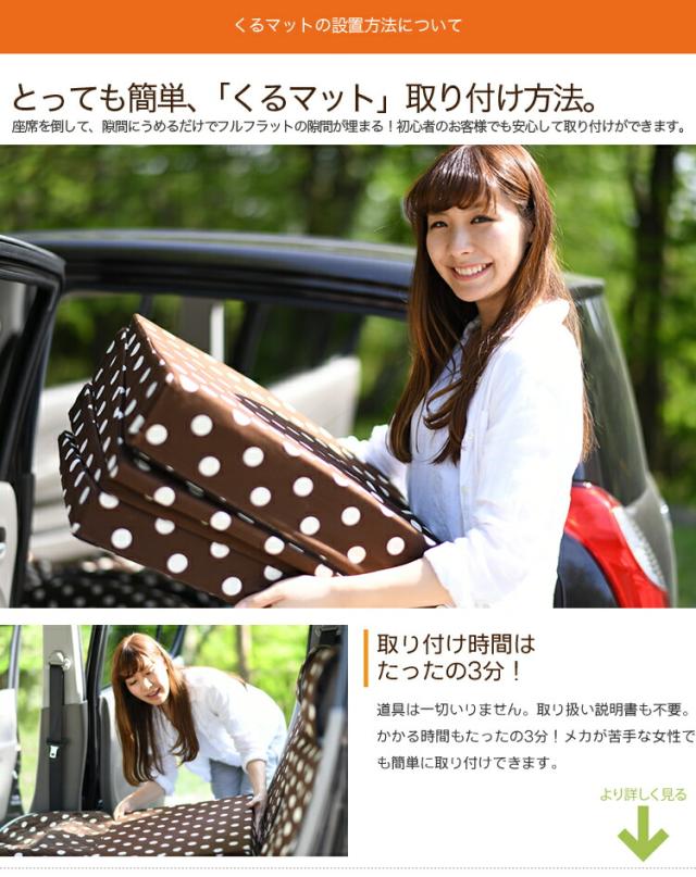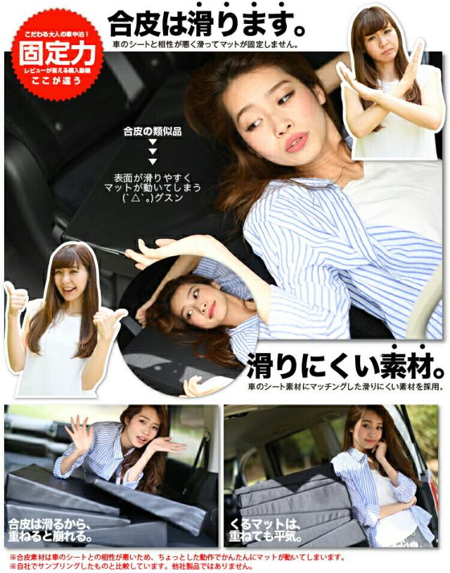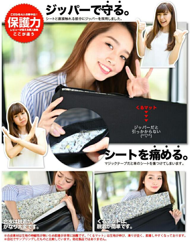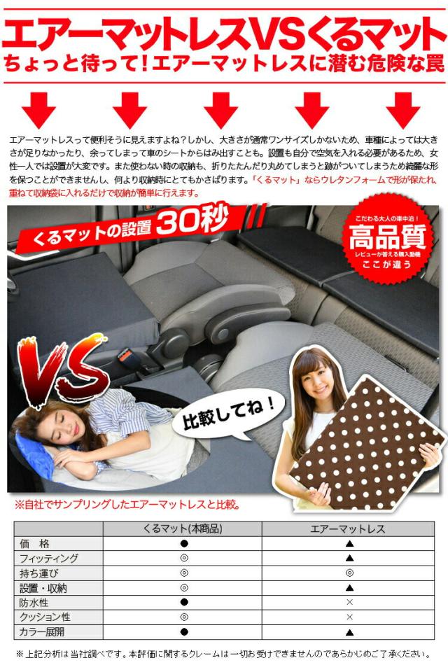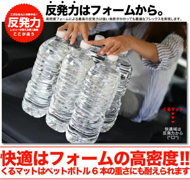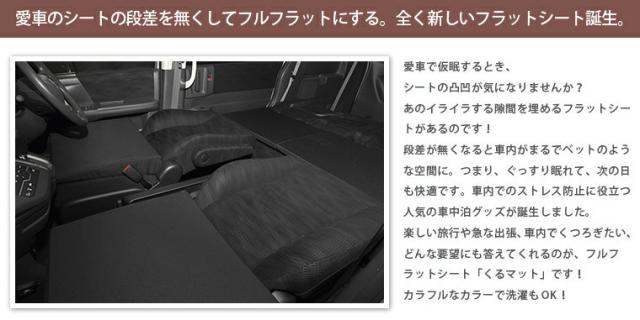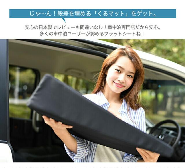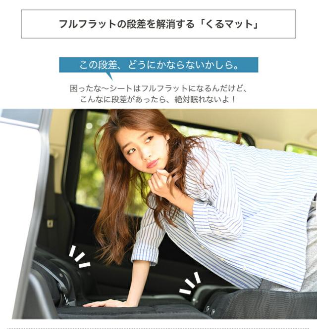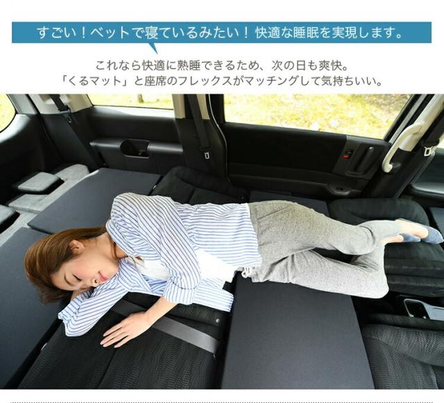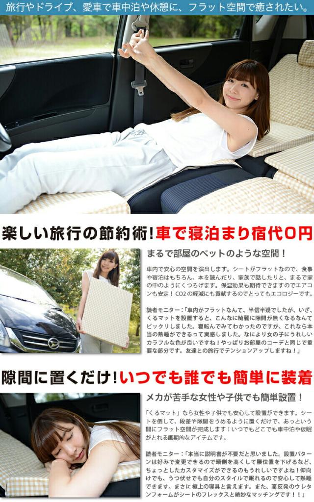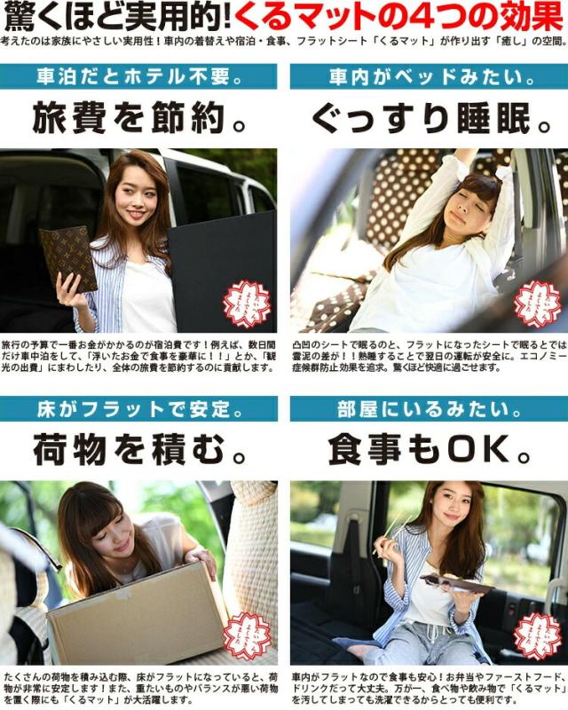 適合車種 | ★軽、普通自動車全般 本製品は汎用品となります。車種によってフィッティングが異なりますので、 あらかじめ商品のサイズを確認の上、ご判断ください。 本製品は汎用品です。商品ページに記載しておりますフラット感は全ての車両で実現できるわけではございません。車両によってはシート自体が完全にリクライニングしないものもございます。あくまでくるマットの有る無しでは「有る」ほうが寝心地が良いと判断するための商品とご理解の上ご検討ください。 |