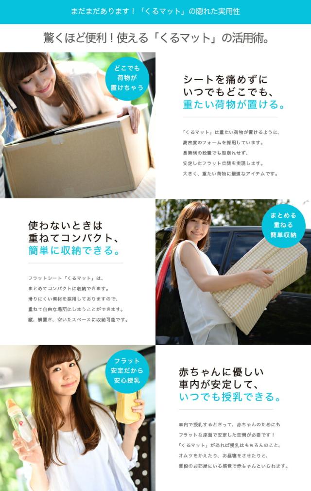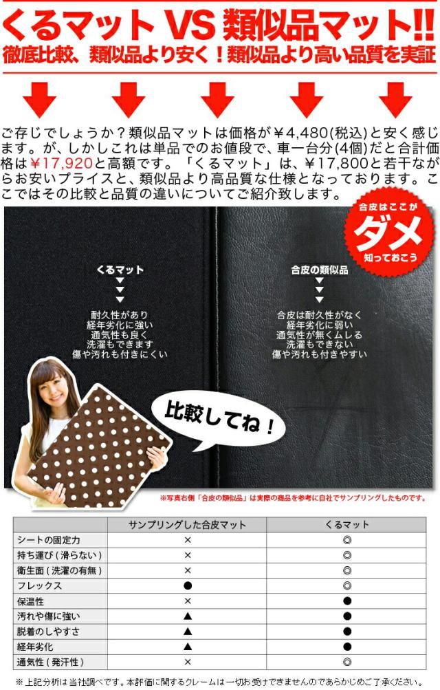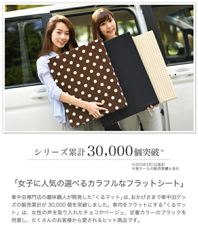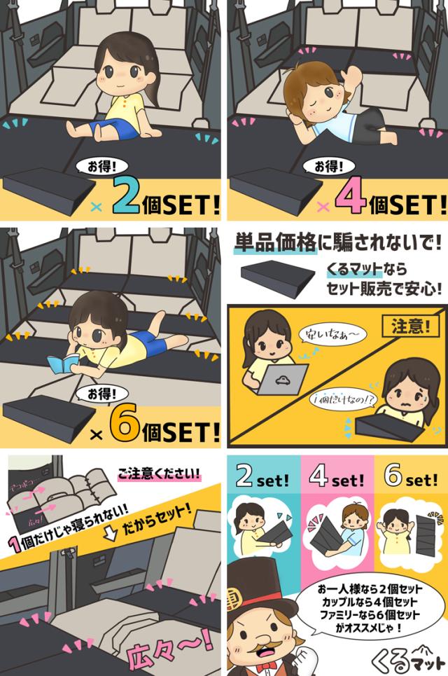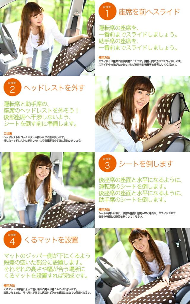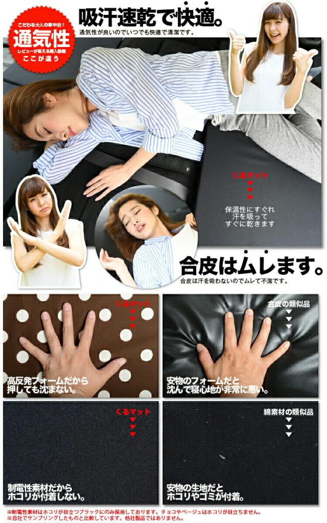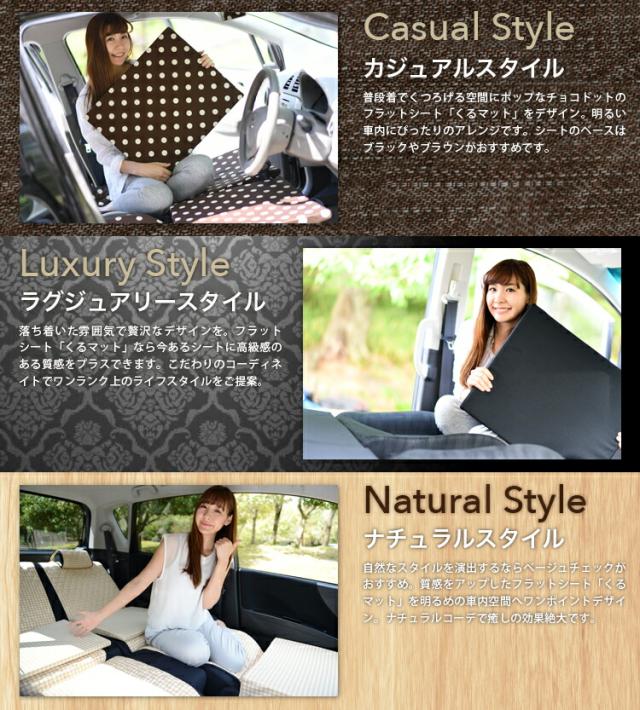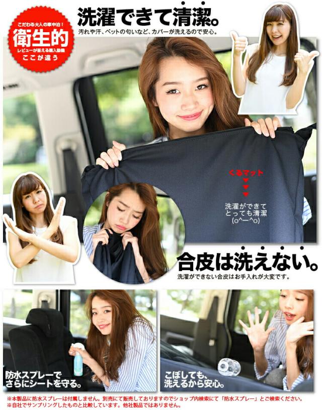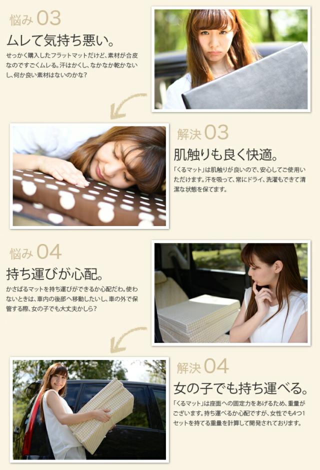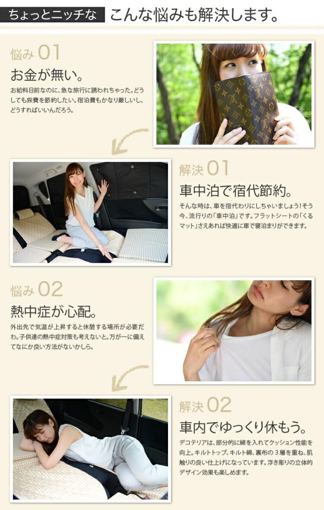 適合車種 | ★軽、普通自動車全般 本製品は汎用品となります。車種によってフィッティングが異なりますので、 あらかじめ商品のサイズを確認の上、ご判断ください。 本製品は汎用品です。商品ページに記載しておりますフラット感は全ての車両で実現できるわけではございません。車両によってはシート自体が完全にリクライニングしないものもございます。あくまでくるマットの有る無しでは「有る」ほうが寝心地が良いと判断するための商品とご理解の上ご検討ください。 |