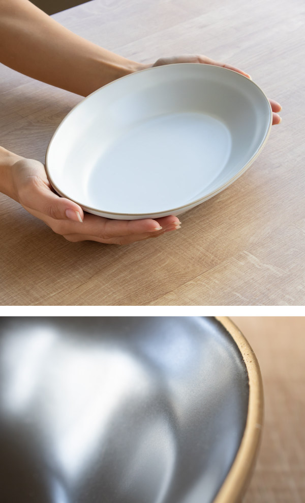 シンプルでモダンなデザインのカレー皿です。カレーやパスタにはもちろん、取り分け用の大皿としてもお使いいただけます。適度な深さもあるので、アクアパッツァなどの汁気の多い料理の盛り付けにも便利です。和洋中問わないデザインで、お料理のジャンルを選ばないので日常使いしやすい器です。