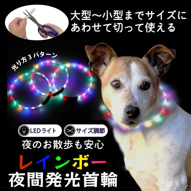 犬 首輪 くびわ くび輪 光る レインボー カラフル 明るい 目立つ 安全 安心 お散歩 夜間発光 暗い くらい 歩道 車道 自転車