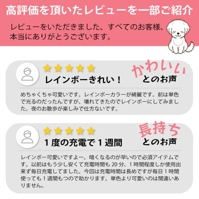 - 冬は暗くなるのが早いので、わんちゃん用の目立つライトを探していました。 レインボーカラーが欲しかったので、イメージどうりの商品でした! 配送も早くて助かりました。