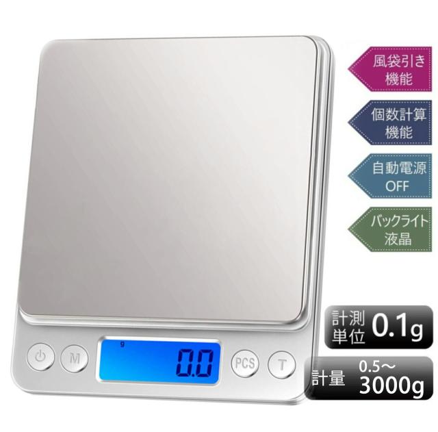 最大約3000g、0.1g単位で計れるデジタルキッチンスケールです。