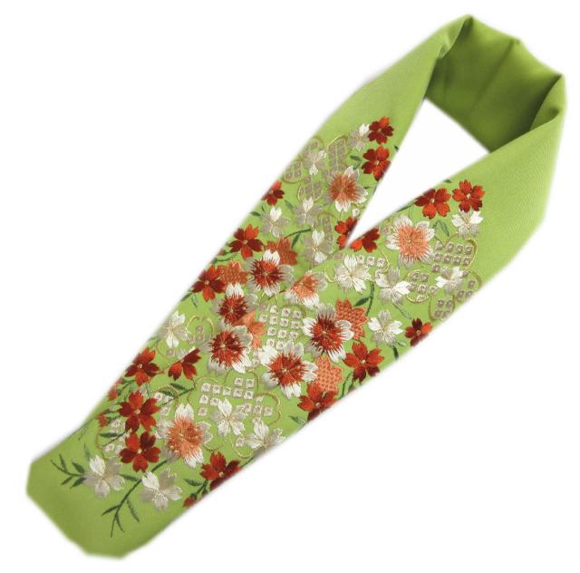 半衿 半襟 刺繍 黄緑色地 金糸入り 桜ひった枝垂さくら 日本製 振袖 成人式 卒業式 袴 はかま 着物 女性用 レディース きもの 振袖用