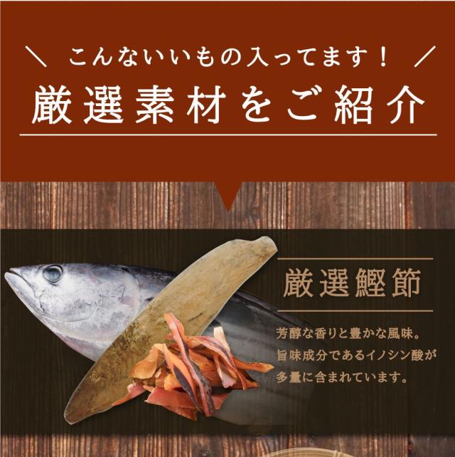 | 食塩(国内製造)、砂糖、かつおぶし粉末、玉ねぎ粉末、さば削りぶし、粉末しょうゆ、焼いりこ粉末、乾燥こんぶ、しいたけ粉末、(一部に小麦・さば・大豆を含む)/調味料(アミノ酸等)、カラメル色素 |