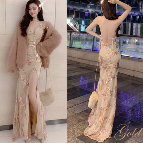 【送料無料(※沖縄、離島除外)】【花柄ゴールドスパンコール装飾&シフォン素材セクシースリットロングドレス】キャバ キャバドレス パーティードレス