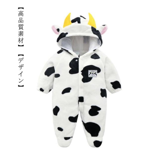 ベビー服 牛柄 ロンパース パジャマ 着ぐるみ カバーオール 新生児 動物着 ルームウェア ベビー 赤ちゃん コスチューム 防寒 キッズ 子供服 暖かい 女の子 男の子 長袖 もこもこ 秋冬 あったか 出産祝い 部屋着 百日祝い 記念写真 70 80 90 95