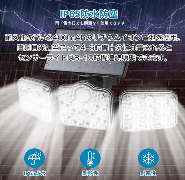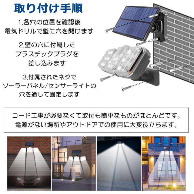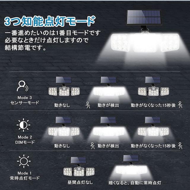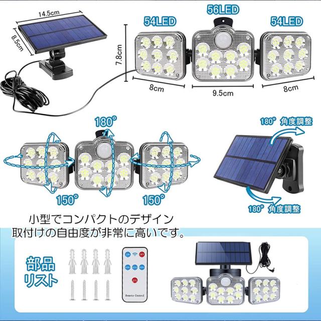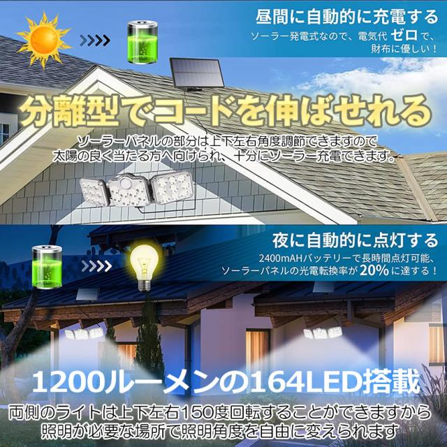 ソーラーライト ソーラーセンサーライト パネル 分離型 3灯式 リモコン 5Mコード 防犯ライト 防災ライト 壁掛け式 164LED 高輝度 屋外照明 玄関 駐車場 SATOU