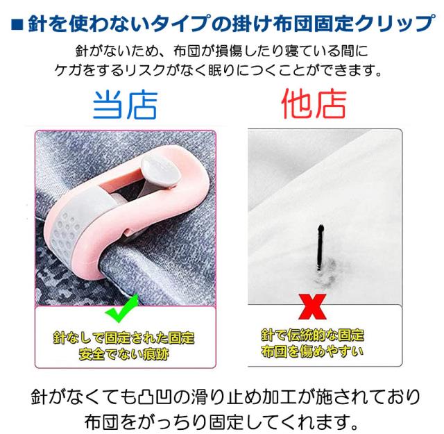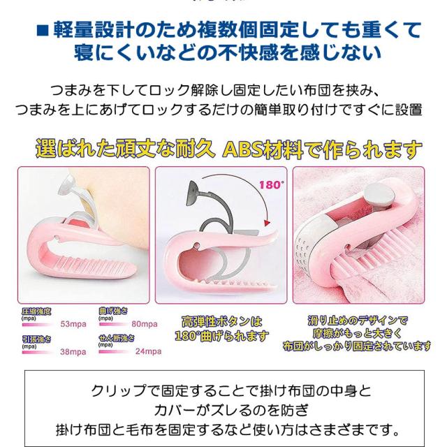 - 布団と毛布がずれてスゴく寝にくかったのですが このクリップで布団と毛布を挟んで固定 スゴく寝やすくなりました また家族の分も購入したいです